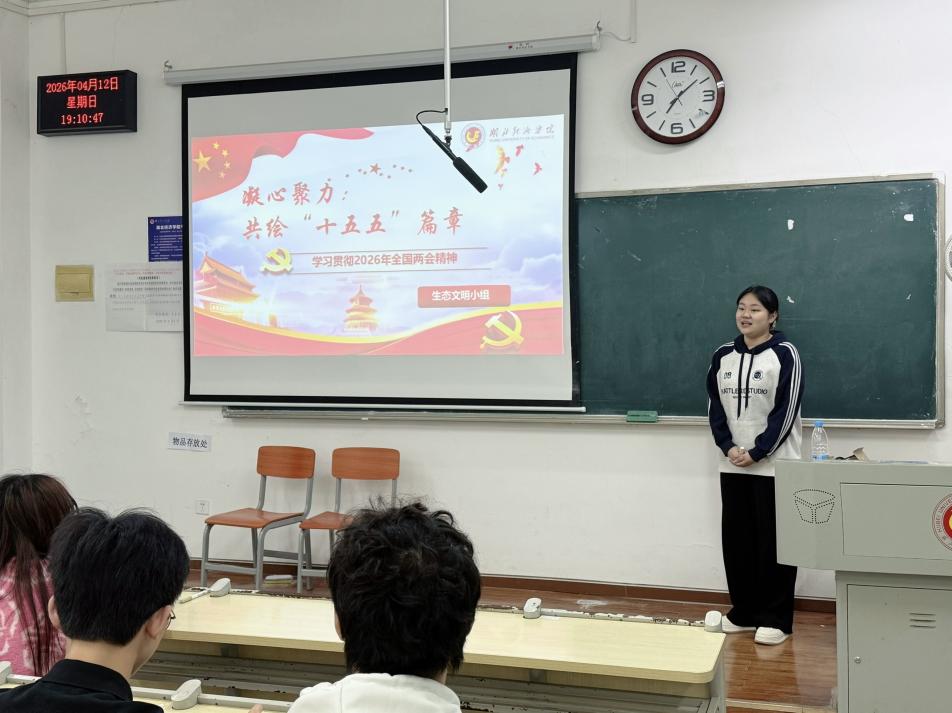 本网讯(通讯员:徐紫盈)4月12日晚,“经叹号”青年宣讲队队员邵寒面向法学2542团支部,开展“学习两会精神,践行青春担当”主题宣讲。宣讲立足“十四五”收官与“十五五”开局的历史方位,系统阐释了高质量发展、内需主导、民生保障等重点部署,着重介绍了《生态环境法典》颁布的里程碑意义,号召青年主动学习两会精神、提升素养、投身实践。本次活动帮助同学们准确把握时代坐标与奋斗方向,强化使命担当,为共绘“十五五”蓝图、推进中国式现代化凝聚青春力量。