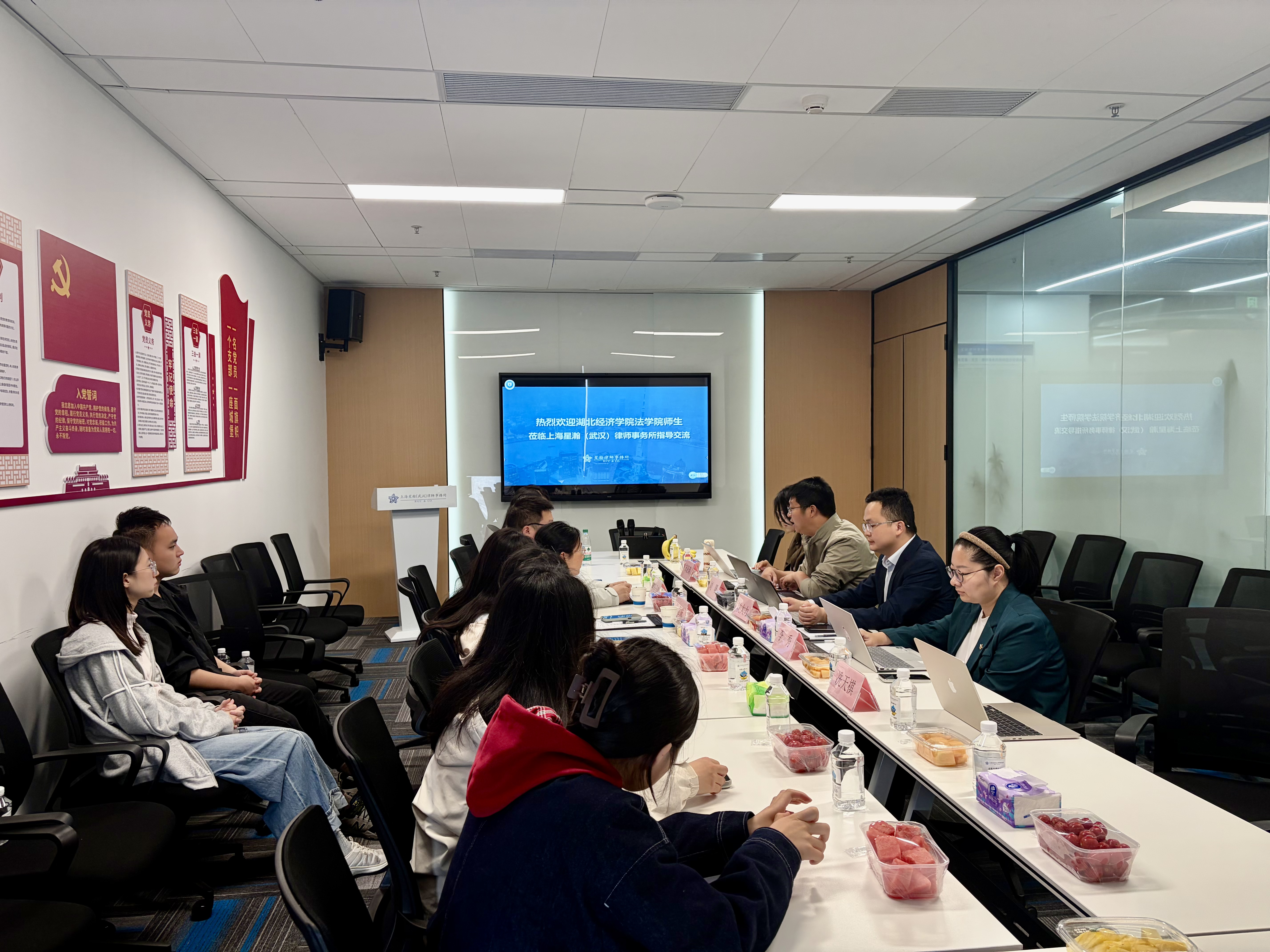 本网讯(通讯员:司马子鸣)2026年4月24日,太阳成集团122ccvip党委副书记钟彦姝、团委书记司马子鸣带领10余名学生赴上海星瀚(武汉)律师事务所(以下简称星瀚武汉律所)开展“扬帆·律途领航”实务交流活动。星瀚武汉律所主任沈大力,市场总监李秀,合伙人律师刘曙以及实习生宋嘉琪、冼天祺出席并全程参与交流。活动由刘曙律师主持。